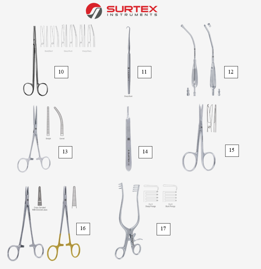Bộ dụng cụ phẫu thuật cao cấp dùng cho phẫu thuật thương hiệu Surtex được nhập khẩu chính hãng từ Anh. Sản phẩm được làm từ chất liệu thép không gỉ cao cấp tiêu chuẩn Châu Âu, đảm bảo an toàn cho mọi ca phẫu thuật. Dụng cụ có thể được khử trùng và tái sử dụng.